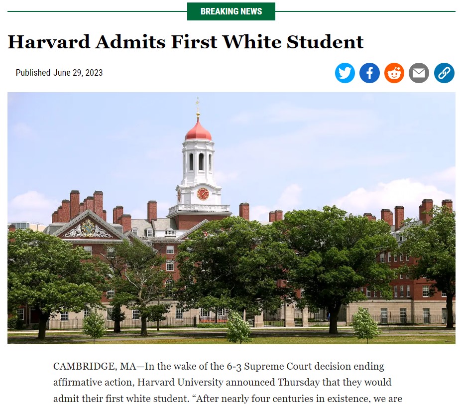 The Onion, Harvard Admits First White Student, June 29th 2023 https://www.theonion.com/harvard-admits-first-white-student-1850591962 (commenting on Students for Fair Admissions Inc. v. Harvard, Affirmative Action Admissions case)