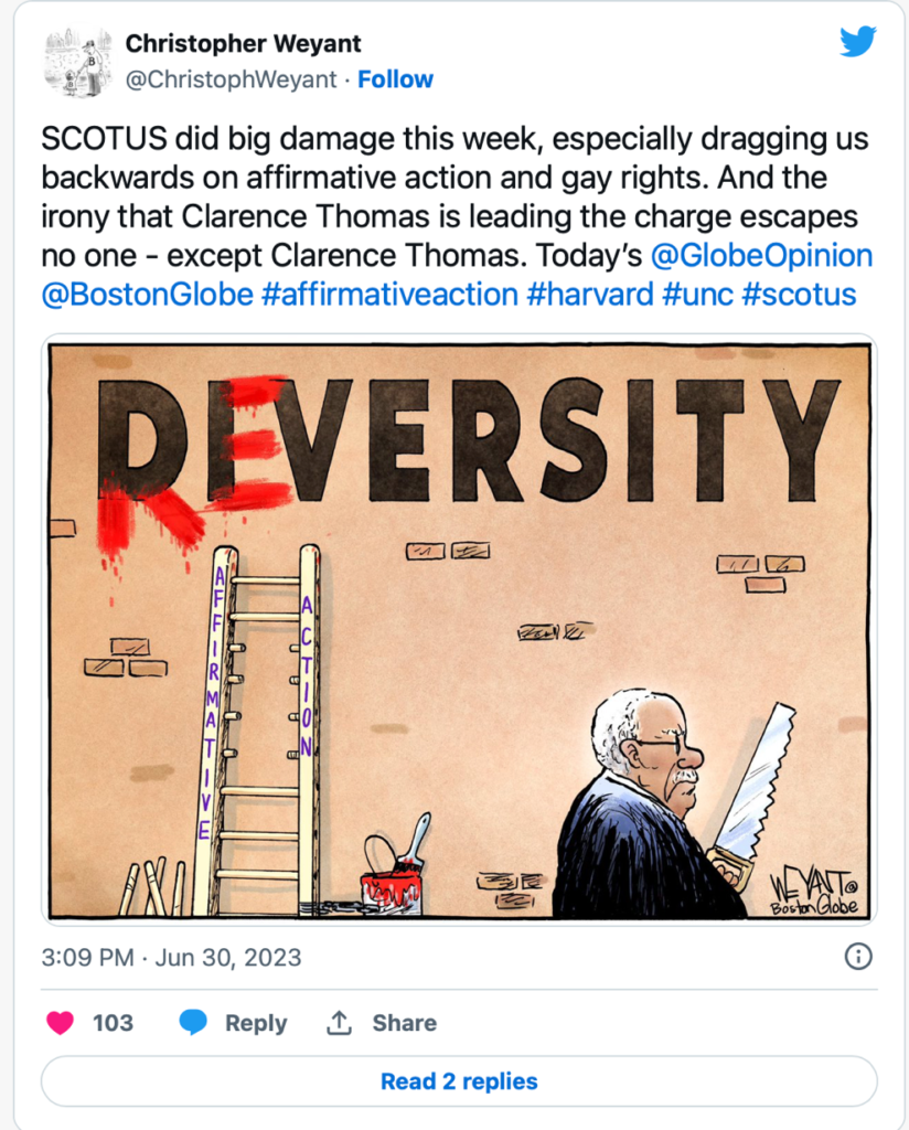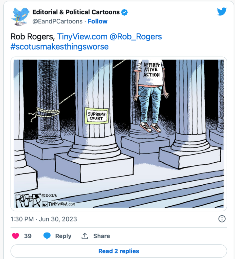 Rob Rogers, Affirmative Action, June 30th, 2023 https://robrogers.com/2023/06/30/affirmative-action-2/  (commenting on Students for Fair Admissions Inc. v. Harvard, Affirmative Action Admissions case)