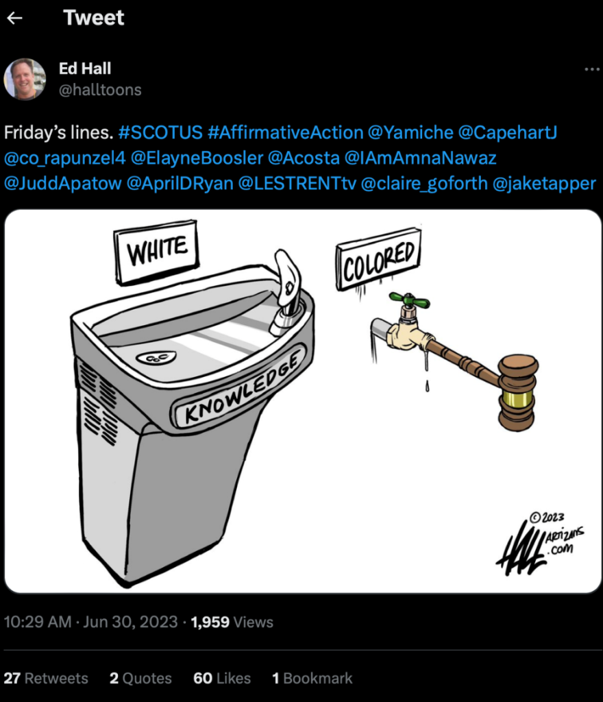 Ed Hall, Friday’s lines., June 30th, 2023,  http://halltoons.com/wordpress1/  (commenting on Students for Fair Admissions Inc. v. Harvard, Affirmative Action Admissions case)
