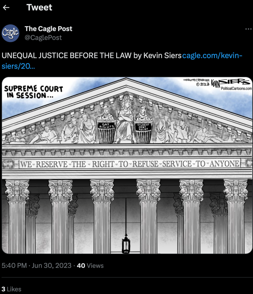 Kevin Siers, Unequal Justice Before the Law, June 30th, 2023, https://www.cagle.com/kevin-siers/2023/06/unequal-justice-before-the-law (commenting on several cases from October Term 2022, particularly 303 Creative LLC v. Elenis, LGBTQ+ Public Accommodations case)